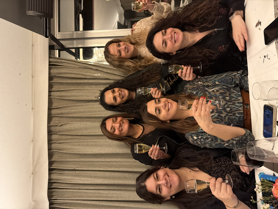 Six smiling women are gathered at a table. Some hold champagne flutes and pose for a photo. A "Fabulous" sash is visible among them. The table is covered with a white tablecloth and scattered with confetti. A mobile phone rests on the table, displaying a time of 23:17. Flowers in a vase are situated at the table's edge. A beige curtain is visible in the background.