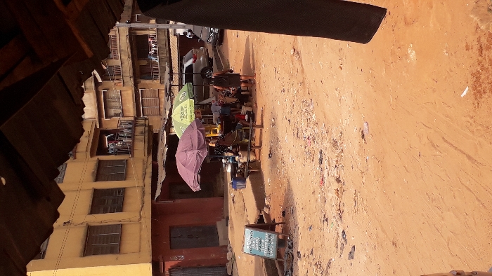 This image depicts a street scene in Onitsha, Nigeria, characterized by informal commerce and residential structures