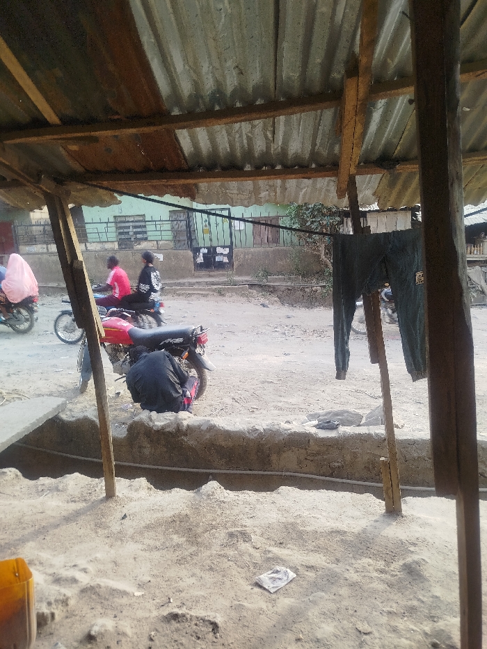 A street scene unfolds under a makeshift corrugated iron roof supported by wooden beams. Two motorcycles are parked. One rider is repairing the other motorcycle next to a low concrete wall. Clothes hang on a makeshift clothesline nearby. In the background are a green building with a black fence and other buildings. The foreground is sandy and bare, with a discarded wrapper on the ground.