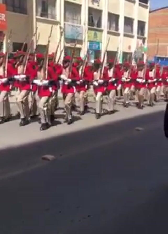 large group of people marching in formation down a city street. The people are wearing matching uniforms consisting of red jackets, light-colored pants, and headwear that appears to be similar in color to their jackets. They are carrying what appear to be rifles. The group is walking in a straight line, maintaining a consistent pace. On either side of the street are buildings. The sky is visible and appears to be blue with no clouds. The video is captured from the side of the street, with the camera panning slightly to keep the marching group in view.
