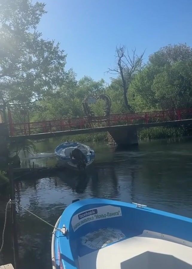 view from a small, blue and white boat on a river. The boat is tied to a wooden dock. In the distance, there's a red pedestrian bridge decorated with a heart-shaped structure. Green trees line the riverbanks. Another boat is visible near the bridge. The sky is clear and blue with the sun shining brightly. The river water is calm, reflecting the sky and surrounding greenery.