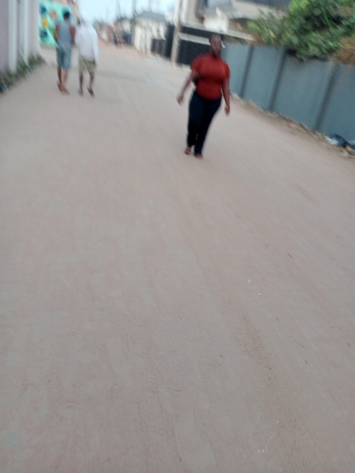 An eye-level, medium shot captures a sandy road in daylight. A woman in a rust-colored shirt and black pants walks towards the right side. Two blurred figures are further up the road, walking away. Buildings line the sides of the road, with a high grey fence visible. The photo appears to be taken while moving, causing the blur.