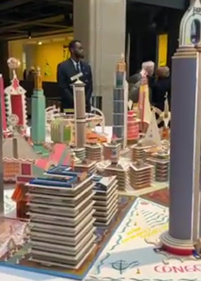 detailed architectural model of a cityscape, comprised of numerous layered, tiered buildings of varying heights, with a mix of square, rectangular, and circular designs. The color palette is diverse, incorporating shades of white, blue, pink, green, and gold. The model is displayed on a white surface decorated with illustrations and text, including the words "Congo Niger". In the background, a man stands in a dark suit with a name tag, likely serving as a security guard or event staff. Other people can be seen passing by in the blurred background. The setting appears to be an art gallery or exhibition space, indicated by the high ceilings, architectural columns, and other artwork in the vicinity.