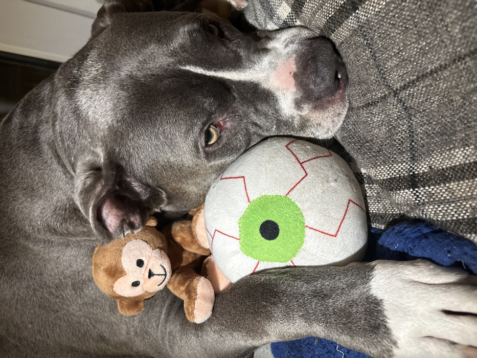 A gray pit bull rests on a striped gray surface. The dog's head is positioned near the top left, with a white stripe running across the forehead and a pink spot on the nose. Yellow eyes are partially visible. The dog cradles a plush monkey and a white plush eyeball with green and red details in its arms. A blue fabric is seen at the bottom right.