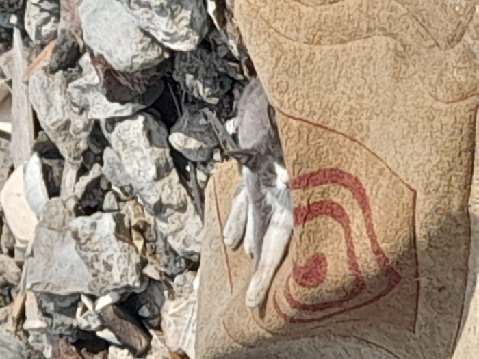 A gray and white domestic cat is observed resting on a light-colored woven textile, possibly a blanket or rug, which features a red, concentric, spiral-like pattern on its visible portion. The cat is positioned with its body curled, head tucked, and paws extended, indicating a state of repose. Behind the cat and textile, a substantial accumulation of light-colored rocks, stones, and debris forms the background. The scene appears to be outdoors in a bright, daylight environment, possibly within the city of Yerevan, Armenia. No human subjects are visible.