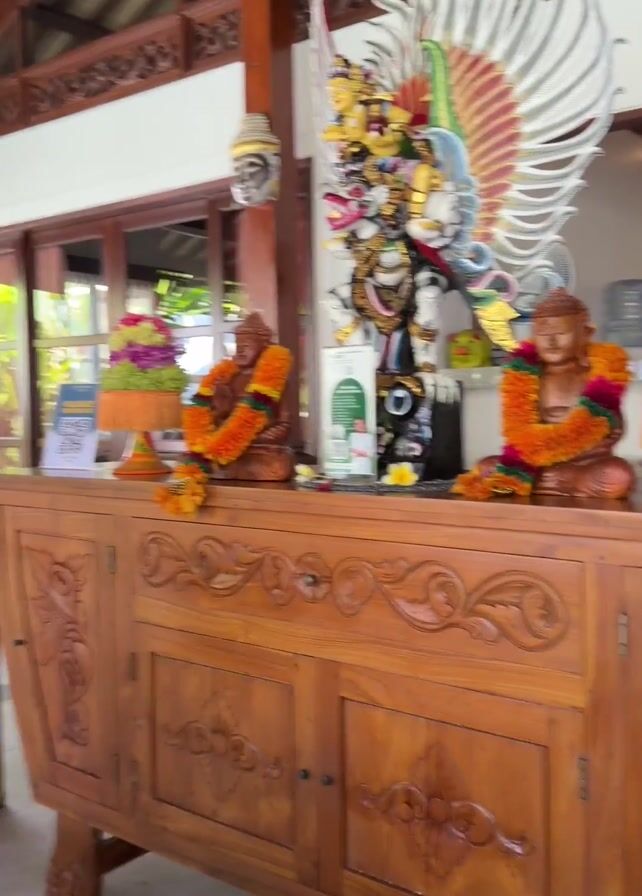 wooden reception counter at what appears to be a hotel or resort in a tropical location. The counter is decorated with a Garuda statue, two Buddha statues adorned with garlands, and arrangements of flowers. Above the counter are additional Buddha heads and various figurines displayed on a wooden shelf. The decor reflects Balinese or Southeast Asian cultural influences. The overall setting suggests a welcoming and tranquil atmosphere.