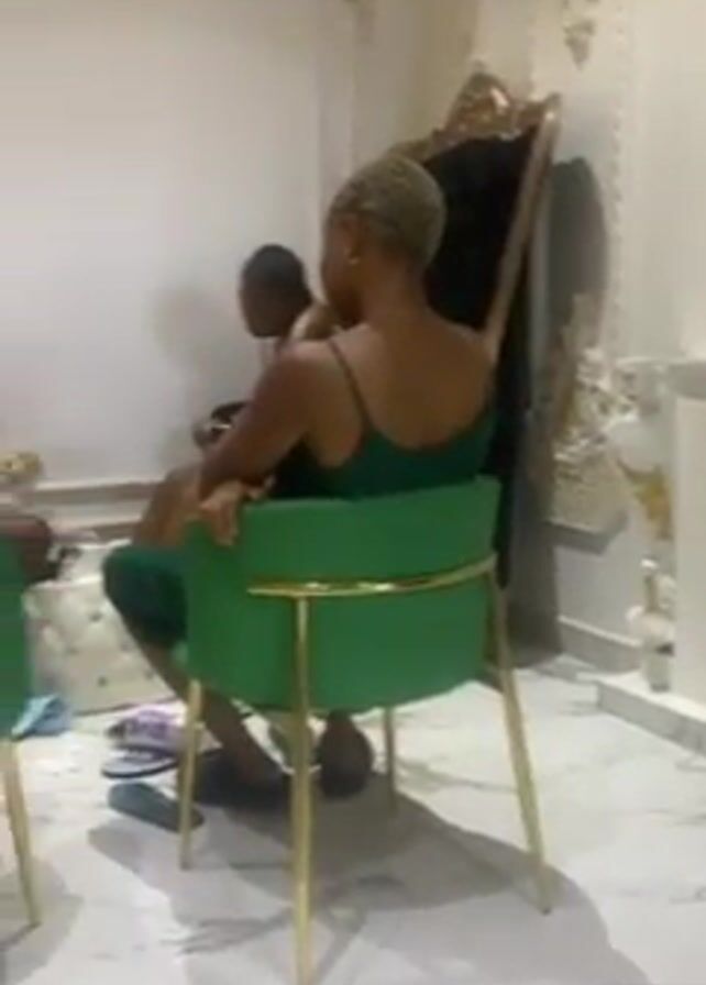 Several individuals are seated in a room with ornate white walls and a marble floor. Two of them are in the foreground sitting on green chairs with gold frames. One wears a green tank top and the other a red and white shirt. One individual takes their shoes off.