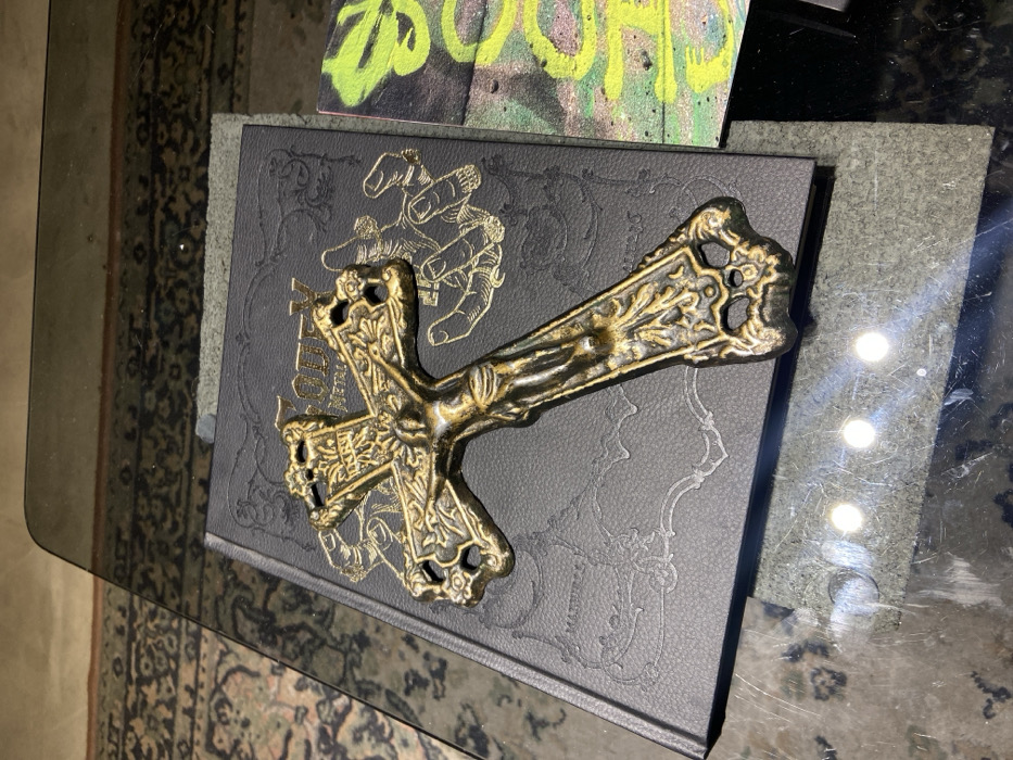 A black leather-bound book with embossed golden designs is the focal point. A golden crucifix rests atop it. The book features ornate designs, including what appears to be hands. The crucifix is highly detailed with a figure of Christ. Above the book is a green and yellow patterned item. The objects rest on a reflective surface, possibly a glass table, which shows surrounding patterns like a rug. The lighting emphasizes reflections and highlights on the cross and the table surface.