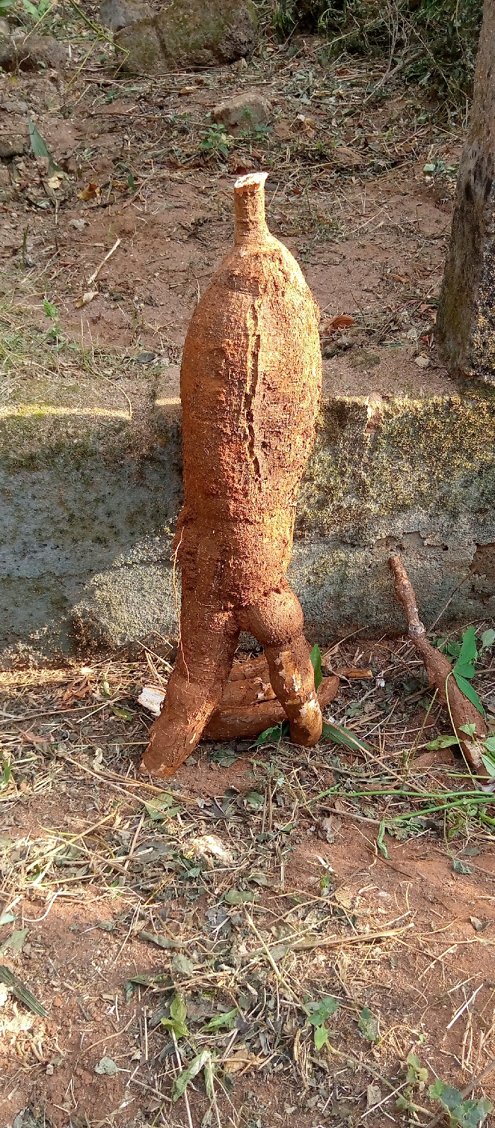 - "A large, freshly harvested cassava root stands upright on reddish-brown soil littered with dry leaves and twigs" by FM-dAQGl2, licensed under CC BY 4.0
