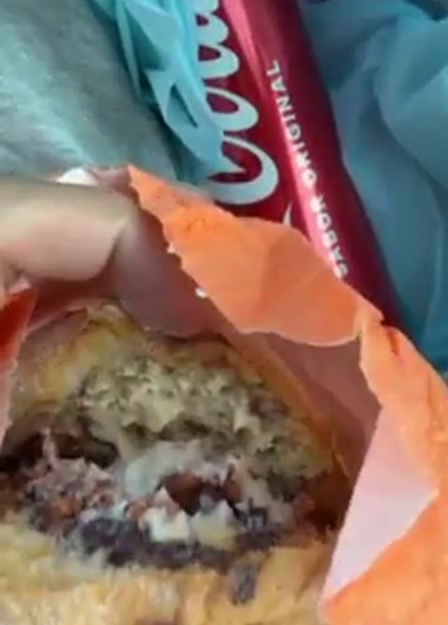 close-up of a hand holding a partially unwrapped hamburger in orange paper. The burger has a white sauce and a dark brown filling. Behind the burger, there is a red and white can of Coca-Cola and a blue plastic bag. The background is blurry. The hand is peeling back the paper to reveal the inside of the burger.