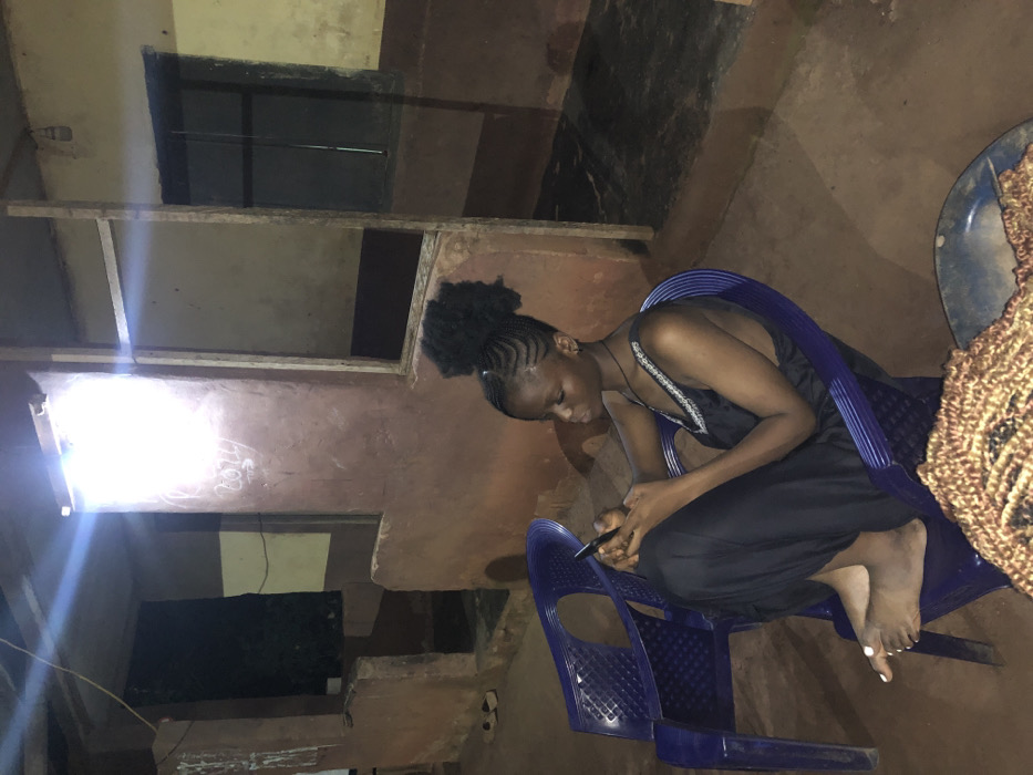 - "An African woman sits on a blue plastic chair inside a dimly lit room with walls painted in earth tones" by FM-YYJbB2, licensed under CC BY 4.0