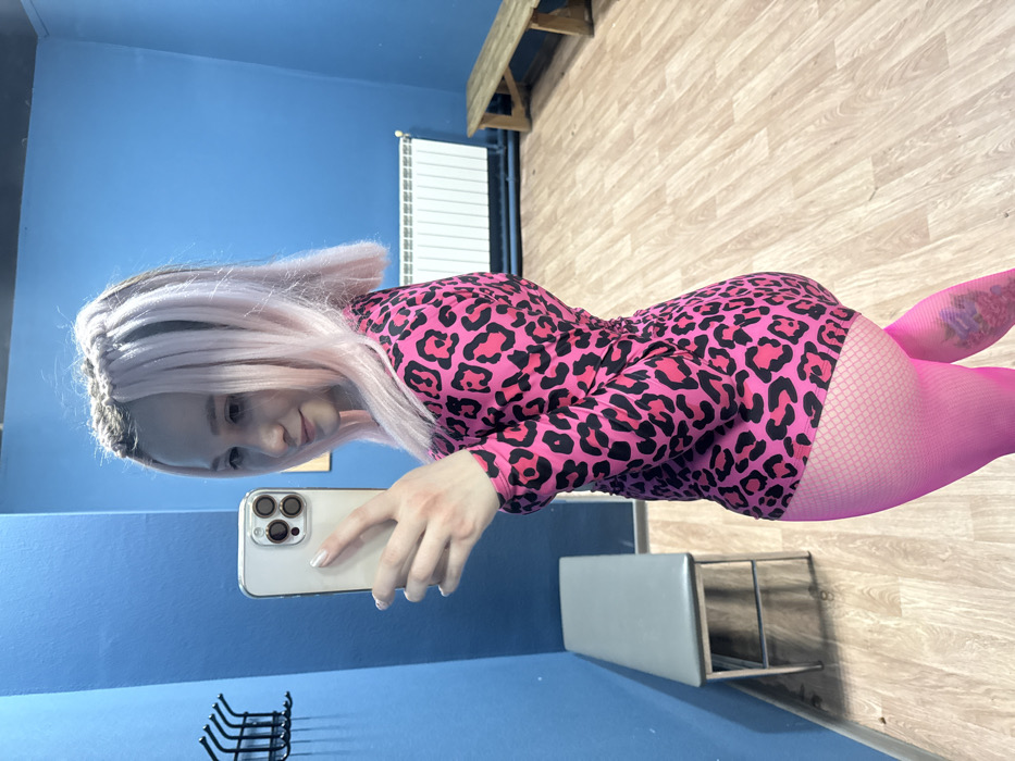 A single female subject is depicted taking a mirror selfie in what appears to be a changing room or studio, located in Saratov, Russia. The subject has long, light pink hair, partially styled with braids at the crown, and wears a long-sleeved, form-fitting bodysuit with a prominent pink and black leopard print pattern. She also wears bright pink fishnet stockings. Her left hand holds a silver-colored smartphone, fitted with a clear case, positioned to capture her reflection in a large mirror. The subject's face is partially obscured by the phone, but she is seen looking towards the phone/mirror with a subtle smile. The immediate environment includes plain blue walls, a light wood-patterned floor, and various objects. On the left side of the frame, a black metal coat rack with multiple hooks is mounted on the blue wall, above a light grey rectangular bench with a metal frame. On the right side of the frame, a white horizontal radiator is mounted on the blue wall, with a rustic, light-colored wooden bench positioned below it.