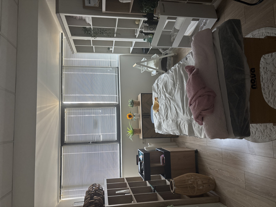 An interior view of an unoccupied treatment room located in Sofia, Bulgaria. The room features light-colored walls, a suspended ceiling, and light wood laminate flooring. Three large windows along the back wall are fitted with horizontal slat blinds, admitting natural light that casts distinct rays onto the ceiling. In the central foreground, a wooden "Nova" brand massage table is draped with white linens, a pink towel, a rolled white towel, a light blue pillow, and a yellow towel. The table is positioned on a circular, light-colored textured rug. To the left, a tall, open-cubby wooden shelving unit displays a dark woven basket on its top shelf and contains various small items. Adjacent to it stands a two-tiered wooden utility cart with black trays, followed by a light-colored, cylindrical, wicker-style floor object. Along the back wall, centered below the windows, is a wooden cabinet featuring a herringbone pattern, topped with two potted green plants and one artificial sunflower. To the right, a tall, white, open-cubby shelving unit holds folded white towels, a trailing green plant, and small decorative elements. Next to it, a shorter white shelving unit displays various bottles and containers. A white, three-tiered rolling cart, containing white towels, is positioned between the treatment table and the right-side shelving units. No individuals are present in the scene.