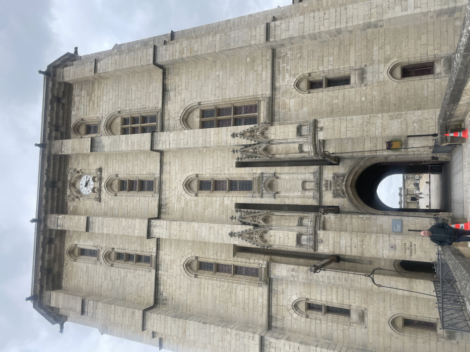 The image displays the imposing Donjon (Keep) of the Château de Vincennes, located in Vincennes, France. The central subject is a tall, light-colored stone tower, exhibiting medieval fortress architecture with Gothic influences. Its facade features numerous narrow, arched windows with dark panes. A prominent clock face, showing approximately 10:45, is centered on an upper section of the tower. Below, a large arched gateway serves as the main entrance, leading into a shaded passage and an exterior courtyard where distant figures are visible. Ornate stone carvings are positioned above the archway. Flanking the entrance are deep vertical recesses, suggesting former drawbridge channels, with heavy chains visible descending on the left side. In the foreground, a stone bridge with dark metal railings extends towards the tower's entrance. On the bridge's left side, near the railing, a sign reads "VISITE CHATEAU." One adult male, wearing a dark jacket, stands on the bridge structure to the left of the entrance, facing slightly towards the archway. Two orange traffic cones are present on the bridge, one on each side of the central path. The sky is overcast and grey, providing soft, diffused lighting to the scene.