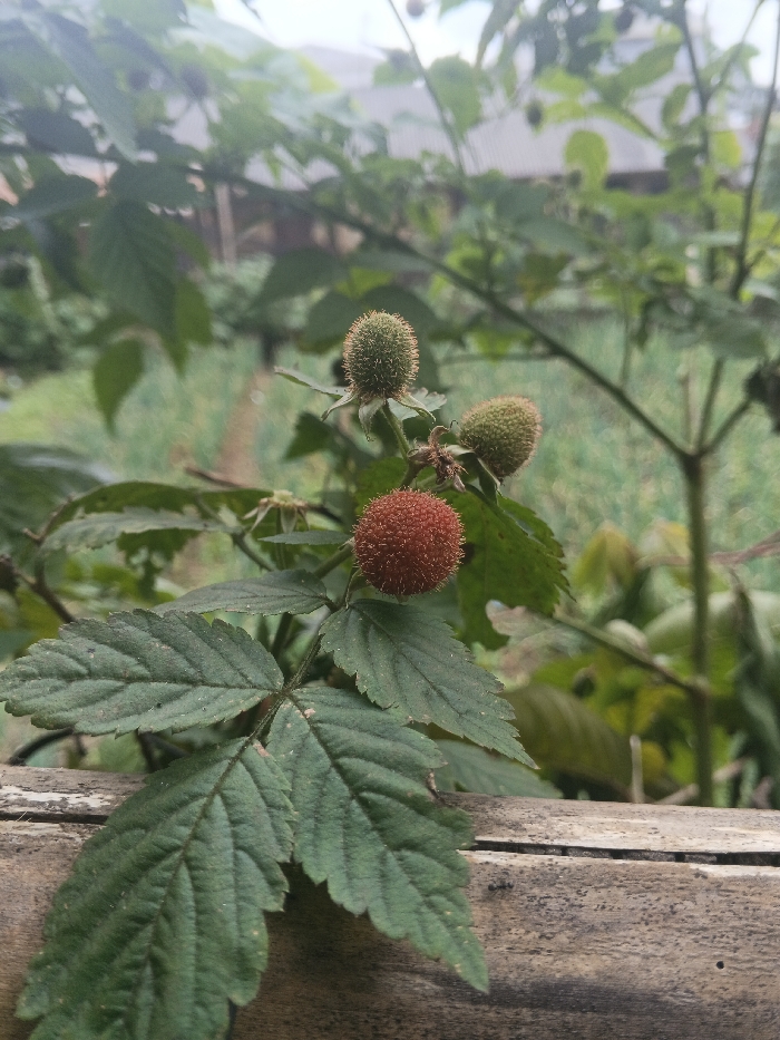The scene depicts a close-up of a plant branch bearing three developing fruits, situated in Bien Hoa, Vietnam. A prominent reddish-orange, spherical fruit with a bristly exterior is positioned on the left side of the frame. Two additional green, spherical fruits, also exhibiting a bristly texture, are visible to the upper right of the red fruit. These fruits are attached to a stem featuring dark green, serrated leaves with clearly defined venation. A horizontal, weathered wooden or bamboo structure occupies the lower portion of the image, positioned beneath the plant. The background is out-of-focus, showing dense green foliage and indistinct structures, including a building with a light-colored roof, partially visible through the vegetation. No individuals or active interactions are present.