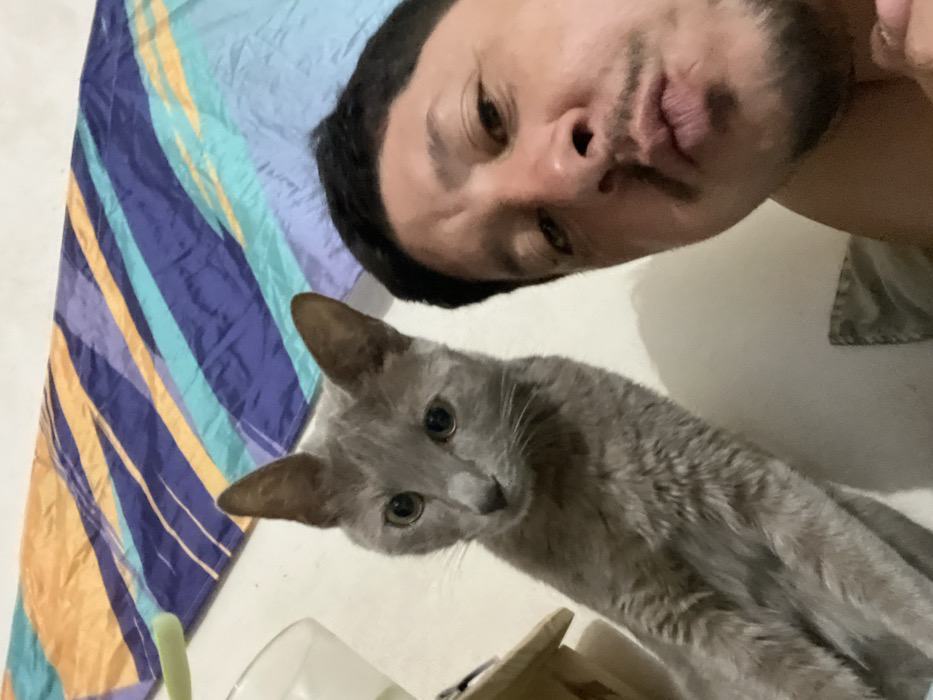 An image taken in Bernal Este, Argentina, depicts an indoor scene featuring one adult male and one domestic cat