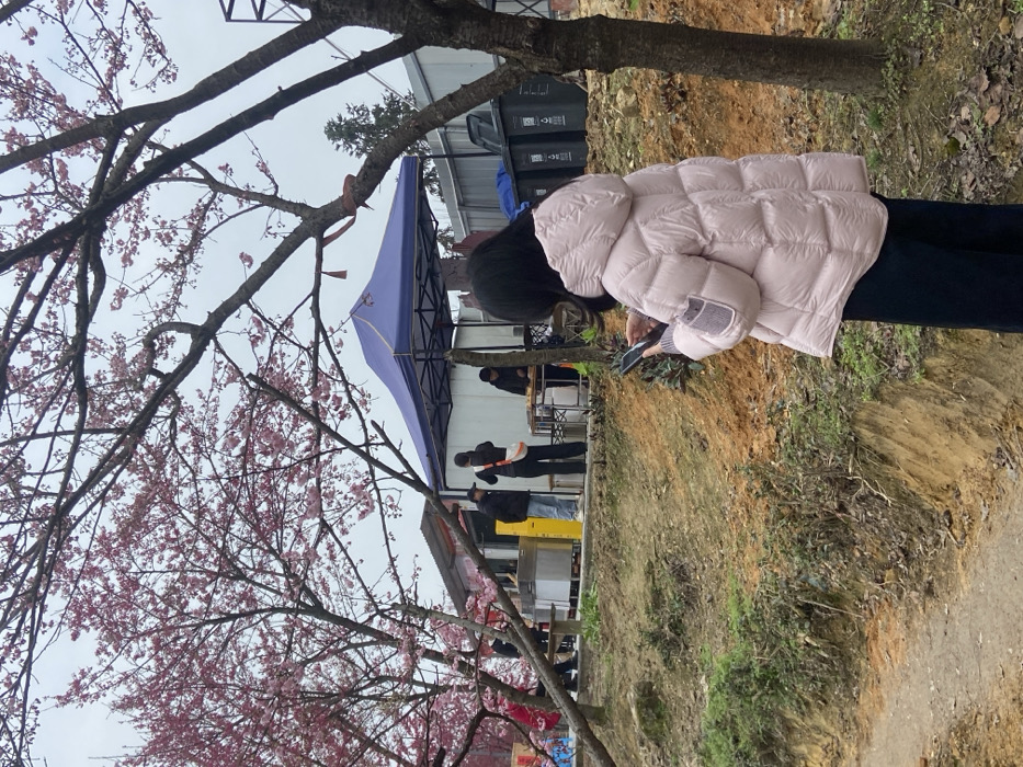A person in a pink puffer jacket stands near a tree with pink blossoms, holding a phone. Behind them, a blue tent is set up with people gathered around tables. In the background, black bins are visible. The surrounding area is a mix of grass and dirt. The photo seems to capture a casual outdoor event or gathering.