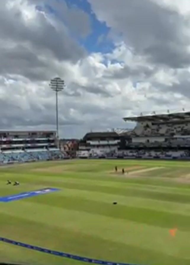 cricket stadium during a match, partially filled with spectators. The green field is marked with blue lines, and several people are present on the field, likely players. A tall light tower stands near the stadium stands. The sky is partly cloudy. There are animated flames added to the scene.