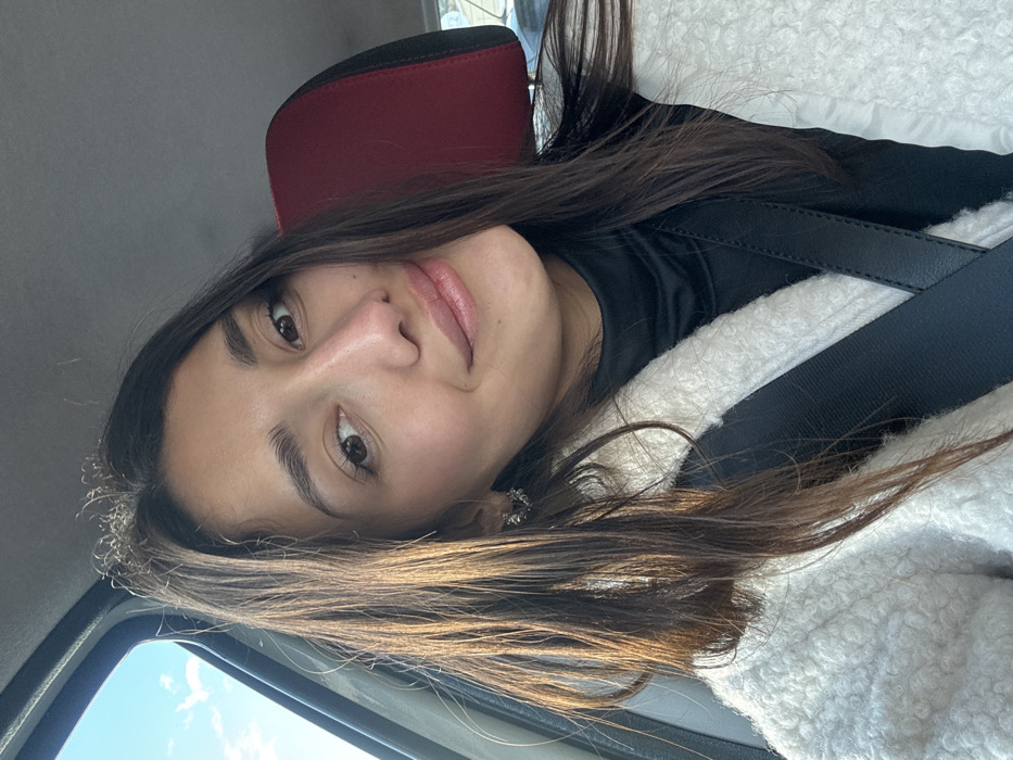 A young woman with long, dark hair sits in a car, wearing a seatbelt
