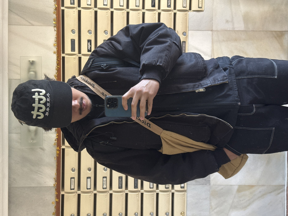 A male individual is depicted in a full-body, front-facing photograph, seemingly captured as a selfie or direct portrait. He wears a black baseball cap featuring white/light green Japanese characters, a black zippered jacket over a dark high-necked inner layer, and dark pants with contrasting white topstitching and multiple pockets. A mustache and goatee are visible on his face. He carries a tan-colored crossbody bag with a "Dickies" branded strap, slung over his right shoulder. In his right hand, he holds a dark teal-colored smartphone with a multi-lens camera array, positioned as if taking the photo. His left hand is placed in his pants pocket. The background consists of multiple horizontal rows of uniformly sized, light beige or cream-colored metal mailboxes, each with a small slot and a placard for identification. These mailboxes are mounted on a light-colored, possibly tiled or marble, wall. The setting indicates an indoor common area, such as a residential building lobby or entrance hall. This architectural and interior design is consistent with apartment buildings commonly found in the city of Madrid, Spain. No specific street address or distinct landmark within Madrid is identifiable.