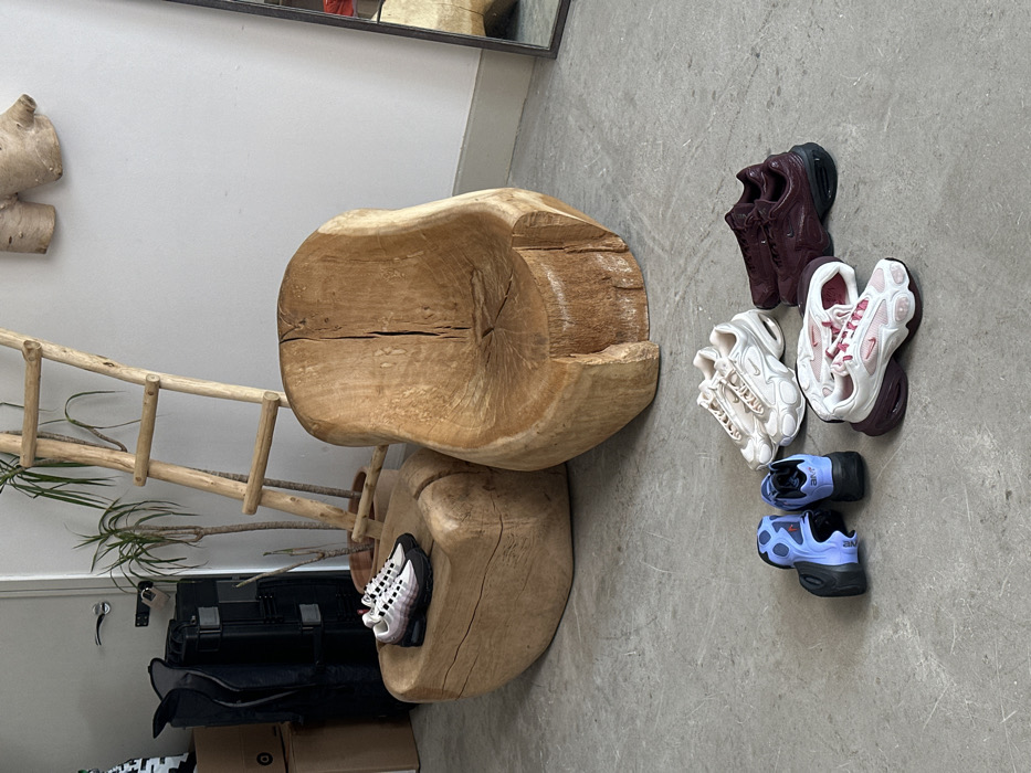 This image captures an indoor scene, likely a showroom or studio, located in London, United Kingdom. The floor is light gray concrete, and the walls are painted white. In the foreground, multiple pairs of athletic shoes are arranged on the floor and a wooden display piece. A pair of white, black, and purple/pink Nike Air Max 95 sneakers rests on a large, irregularly shaped wooden block, which serves as a low table or plinth. Adjacent to this, a larger, uniquely carved wooden chair, fashioned from a tree trunk, stands prominently. On the concrete floor, below these wooden items, are four additional pairs of footwear: one pair of light beige/white sneakers, one pair of dark burgundy/maroon sneakers, one pair of white and pink sneakers with chunky burgundy soles, and one pair of blue slip-on mules with black soles. In the background, a rustic, light-toned wooden ladder leans against the white wall, with a tall, slender-leaved potted plant positioned behind it. To the far left, a black hard-shell case, a black bag, and a cardboard box are stacked against the wall. A mirror with a dark frame leans against the wall on the right side, reflecting a portion of the wooden chair. An abstract, gnarled piece of wood is mounted on the wall above the mirror. No individuals are present in the scene.