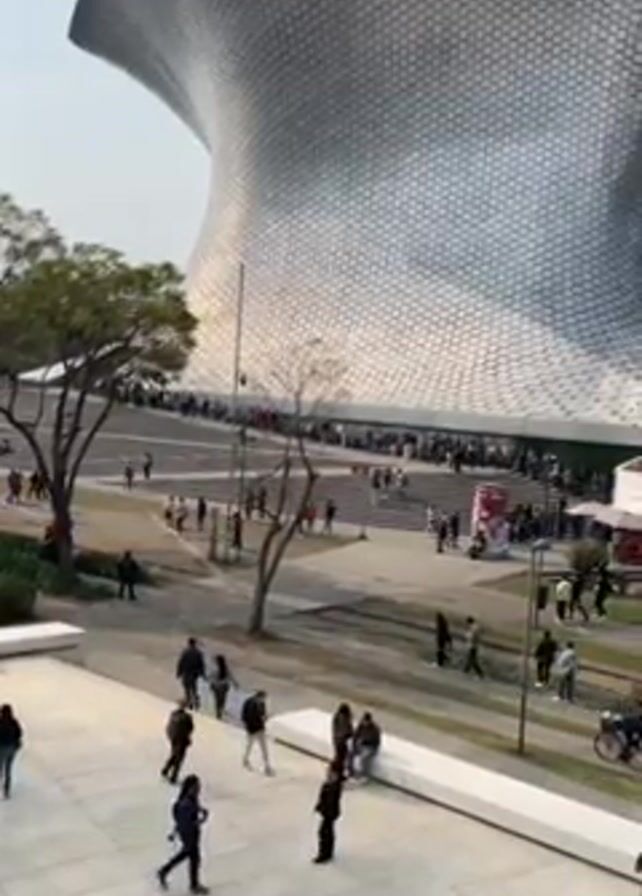 modern, curving building with a facade made of hexagonal tiles, likely located in a city. The structure is surrounded by a paved area with trees and grass. People are walking, sitting, and waiting in line around the building. There are also some vendors in the vicinity.