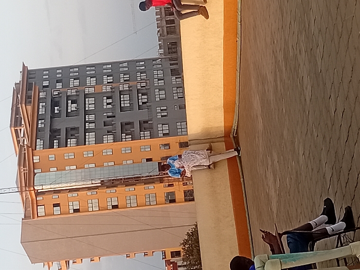 The scene depicts an urban rooftop in Karingani ward, Kenya, featuring three male individuals. The rooftop surface is paved with dark grey interlocking bricks laid in a herringbone pattern. A beige-colored parapet wall with an orange stripe along its base runs across the midground. On the far left, a male is seated in a light-colored chair, looking down at a mobile phone held in his hands. He wears a blue top, dark shorts, white socks with a black logo, and black shoes. In the center, another male is perched atop the parapet wall, facing left, wearing a light-colored patterned hoodie, light-colored pants, and black shoes. On the far right, a third male is also perched on the parapet wall, facing right, dressed in a red shirt, dark pants, and light-colored shoes. In the background, two prominent multi-story buildings are visible. The building to the left is predominantly beige/orange, featuring numerous windows and a tall vertical glass panel on its facade, with an antenna or mast-like structure extending from its roof. The building to the right is largely grey, also with multiple windows, and appears to be in an unfinished state at its upper levels. The sky is clear and light.