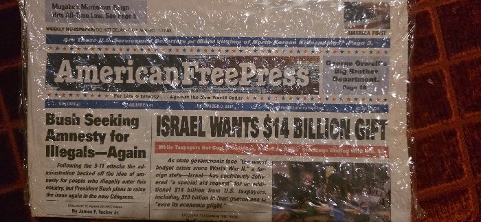 - "A newspaper, identified as "American Free Press" with a red, white, and blue star-and-stripe motif, is displayed vertically and encased in crinkled, transparent plastic wrapping" by FM-TnHsk2, licensed under CC BY 4.0