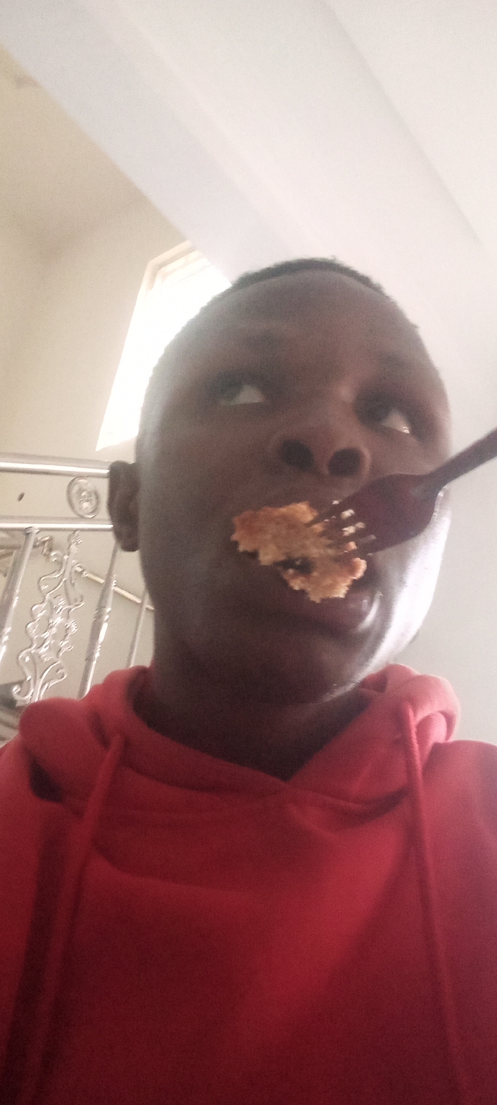 The image displays an individual, an adult male with a dark complexion and short dark hair, positioned facing upwards and slightly to the right. He is wearing a red hooded sweatshirt. A dark-colored fork is held near his slightly open mouth, laden with a light brown, textured food item containing darker inclusions. His eyes are directed upwards. The background features light-colored walls and ceiling, with a bright, rectangular light source, likely a window or skylight, visible in the upper right. To the left of the subject, a silvery-metallic structure with decorative scrollwork, possibly part of a railing or furniture, is partially visible. The scene is located in Unknown, Unknown.