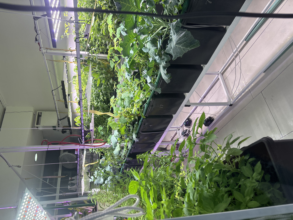 n indoor vertical farm setup. Plants are cultivated in multiple rows of black containers stacked on white metal shelving units. Artificial grow lights illuminate the greenery. Varieties of plants, including leafy greens and possible vegetable crops, grow densely. A white tiled wall and additional infrastructure, such as fans and electrical wiring, are also visible.