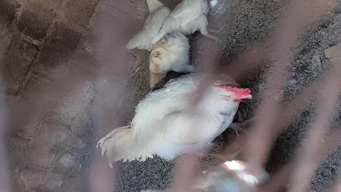 The image captures an enclosed area in Kuru, Nigeria, populated by several domestic chickens. A prominent large white chicken, featuring a red comb and wattle, is centrally positioned in the foreground, with its head directed downwards towards the dark, granular ground, consistent with feeding behavior. To the right and slightly behind, multiple smaller, primarily white-feathered chickens are visible, one displaying light brown markings on its back, also positioned low to the ground near a translucent container, possibly a feeder. The background consists of a dark, rough-textured wall, likely constructed from brick or concrete. Faint, blurred vertical lines in the immediate foreground suggest a protective barrier or enclosure separating the camera from the subjects.