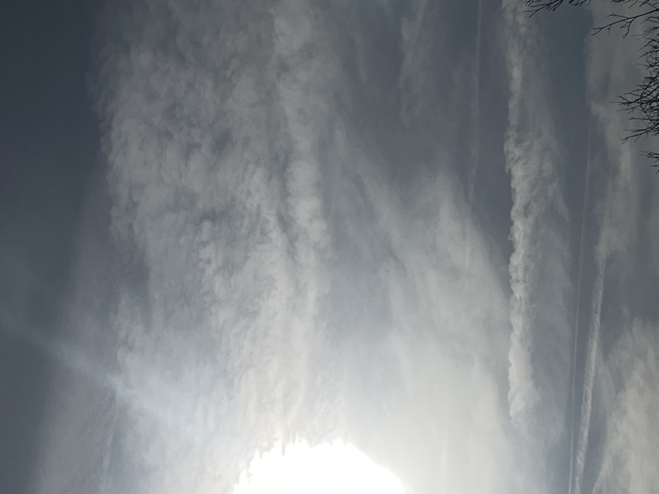 The scene depicts an overcast sky over Trastikovo, Bulgaria. A bright, partially obscured sun is visible on the left side, emitting a strong glare and illuminating surrounding white and light gray cloud formations. The cloud cover extends across the entire frame, transitioning to darker shades of gray and blue-gray towards the top and right. Multiple linear contrails, consistent with aircraft exhaust, traverse the mid-ground and upper-right sections of the sky. In the lower right corner, silhouetted against the sky, are the bare, dark branches of a deciduous tree. No individuals or specific actions are discernible.
