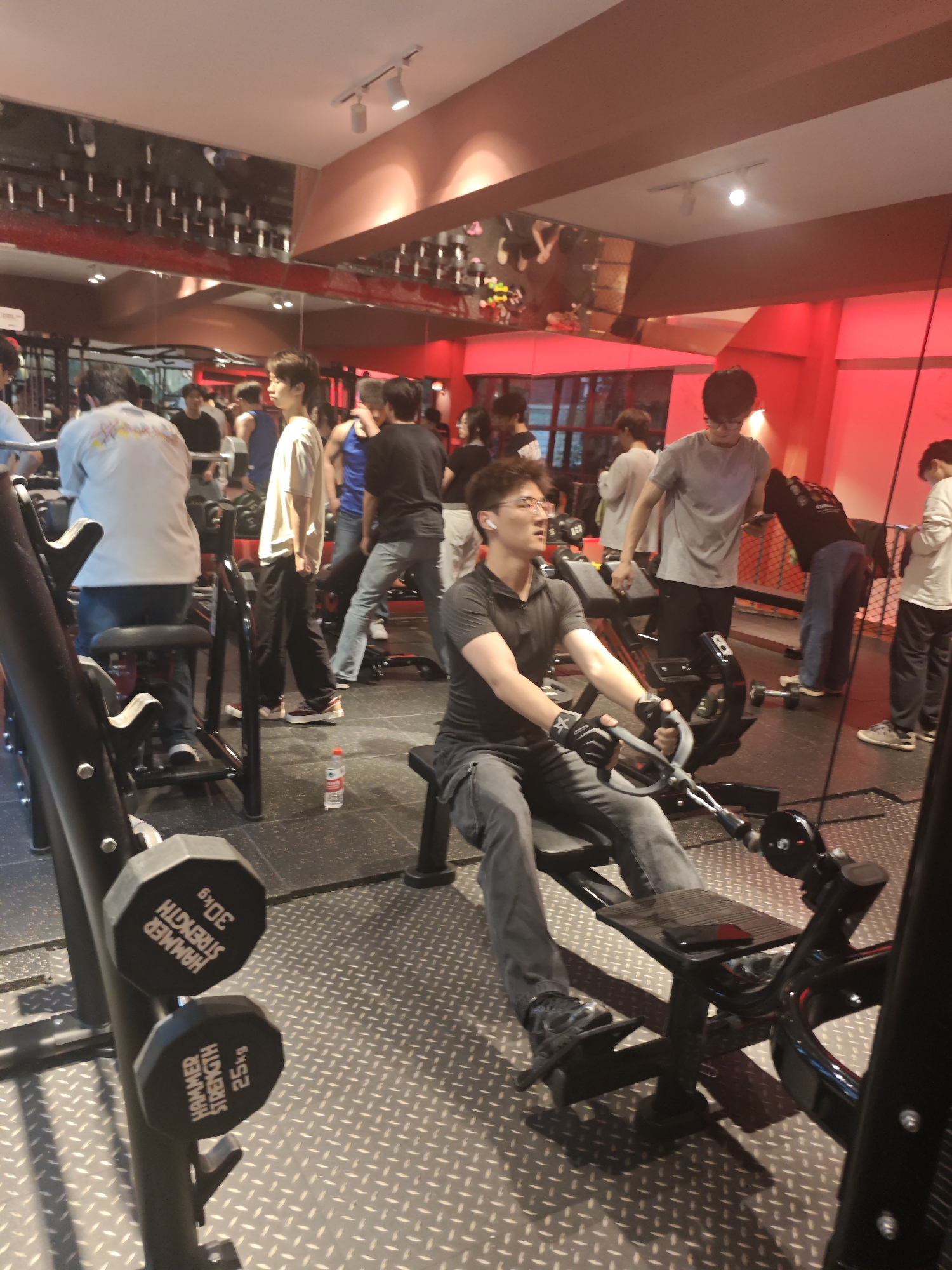 The image depicts the interior of a gym, likely located in the Chongqing High-tech Zone, China. A man is using a seated cable row machine, wearing gray jeans, a dark polo shirt, and workout gloves. Several other people are in the background, some using other exercise equipment, and others standing or walking. The gym features mirrored walls and a weight rack. The floor is metal with a textured pattern. A water bottle is visible on the floor near the cable row machine.