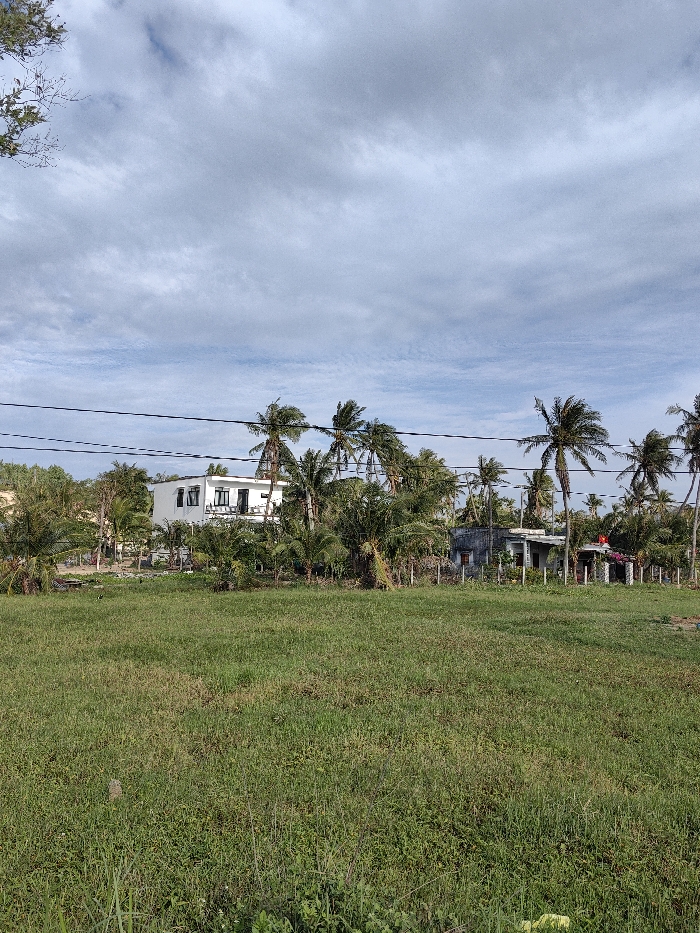 The image displays an undeveloped plot of land in Tuy Phong 4, Vietnam, under a cloudy sky