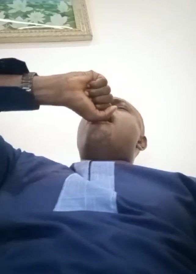 A close-up, low-angle shot shows a bald man in a blue shirt with a light blue design. He raises his fist to his forehead, then brings it down. A silver watch is visible on his left wrist. A framed picture hangs on the white wall behind him.