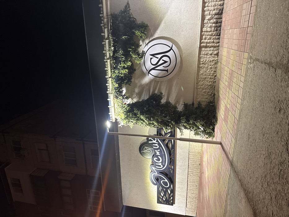 The image depicts an illuminated street scene at night in Vidin, Bulgaria, specifically at the location of "Мистик ресторант-градина" (Mystic Restaurant-Garden), identifiable by signage. The foreground features a dark asphalt road surface transitioning to a pedestrian area paved with red, yellow, and beige rectangular pavers. Centrally positioned, a grey metal street light pole with a bright LED fixture casts light onto the scene. The main subject is the facade of a light-colored commercial building, likely a restaurant, which is adjoined by a multi-story residential building partially visible in the darkened background. The lower section of the commercial building's wall features a textured stone base. Two prominent, illuminated signs are mounted on the wall. To the left, a large, horizontal sign displays the word "Мистик" (Mystic) in stylized white Cyrillic script with a black outline, set against a dark panel with a decorative leaf-like pattern. Below it, smaller script reads "ресторант-градина" (restaurant-garden). To the right, a circular sign features the letters "NSA" in stylized black capital letters on a white background, enclosed within a black ring. Evergreen foliage, resembling a garland or branches, is draped along the top edge of the commercial building's wall, partially obscuring a gutter or cornice, and extends vertically downwards in a dense column near the center, adjacent to the street light pole. No individuals or active subjects are present in the frame. The sky is dark, indicating nighttime conditions.