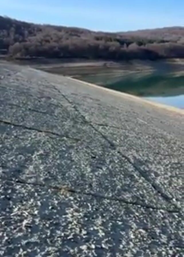 tranquil landscape with a dam and a lake. The dam is made of gray, rough material, possibly concrete or stone, with visible cracks and lines running across its surface. The lake is calm and blue, reflecting the clear sky and the wooded hills on the opposite shore. The hills are covered with leafless trees, indicating it might be late autumn or early spring. The overall atmosphere is peaceful and serene, with the clear sky suggesting a bright, sunny day. The camera slowly pans across the scene, capturing the details of the dam, the lake, and the surrounding nature.