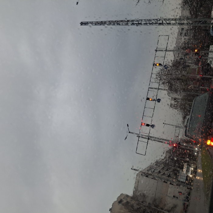 The image depicts an urban intersection in Plovdiv, Bulgaria, specifically at the junction of Boulevard Shesti Septemvri and Boulevard Tsar Boris III Obedinitel. The scene is observed from inside a vehicle, with raindrops visible on the windshield, indicating wet or rainy conditions under an overcast, grey sky. In the immediate foreground, the rear of a dark-colored sedan is visible. Directly ahead, an overhead gantry spans the roadway, supporting multiple traffic lights. One vertical stack of lights on the gantry displays a red signal, while two other vertical stacks display yellow signals. A pole-mounted traffic light on the far left also shows a red signal, and another on the far right displays a yellow signal. To the left, multiple multi-story residential or commercial buildings line the street. A white van with illuminated headlights is visible in the mid-left portion of the frame, moving or stopped. To the right, more multi-story buildings are visible through leafless trees. A tall, grey lattice-structured communications or utility tower stands prominently on the right side of the street. The road surface appears wet, and a small patch of green vegetation is present in the lower-left corner. No individuals are distinctly identifiable.