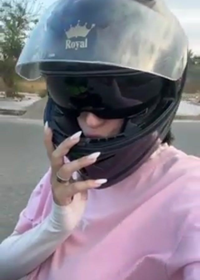 A person wearing a pink shirt and a black motorcycle helmet is standing on the side of a paved road. The helmet has a flip-down visor, and the brand "Royal" is visible on the top. The person has long, white nails and a ring on their finger. They hold their hand up to their face and make a peace sign. The helmet then turns to reveal neon green accents. In the background, there are some buildings and a blue sky with clouds. A large bus with a green stripe is visible across the road.