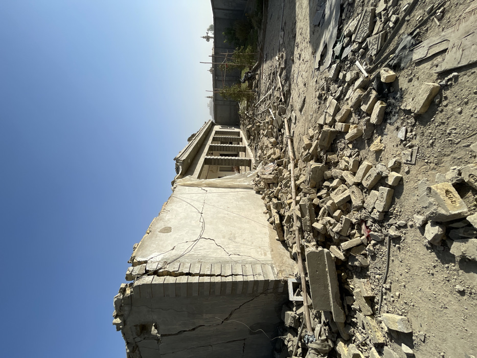 The image displays a scene of significant structural damage to a single-story building in Spin Boldak, Afghanistan, under a clear, bright blue sky