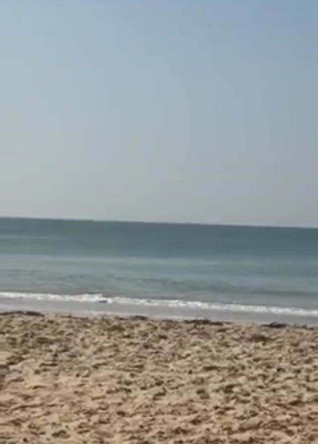 beach with a sandy foreground, meeting the calm, light-blue sea under a clear, bright sky