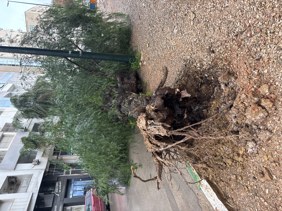 A tree uprooted on a city sidewalk, roots exposed from the ground