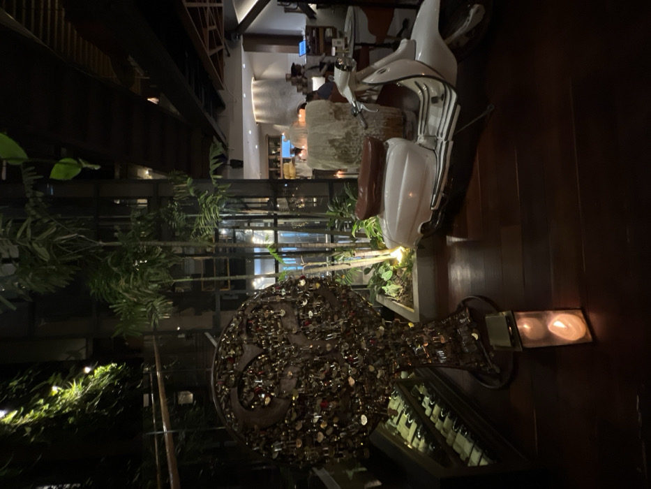A creatively decorated interior space showcases an eclectic mix of elements. A white scooter rests near potted plants. A unique art piece covered in small, shiny objects stands nearby, casting reflections on a glass-covered display of wine bottles. Candles provide soft light. The interior suggests a restaurant or bar with a blend of modern and rustic design, creating an interesting atmosphere.