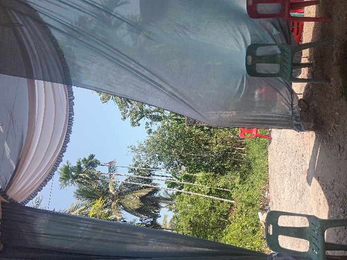 The scene is framed by a canopy of draped fabric in shades of gray and white. Outside the canopy, there is a lush green landscape filled with trees, including palm trees silhouetted against a bright blue sky. Scattered within the covered area are plastic chairs in red and green, suggesting a gathering or event. The ground appears to be a mix of dirt and concrete.