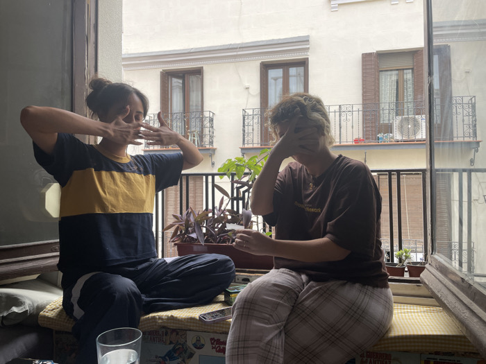 Two individuals are seated indoors by an open window, obscuring their faces with their hands, looking out onto a residential street in Madrid, Spain