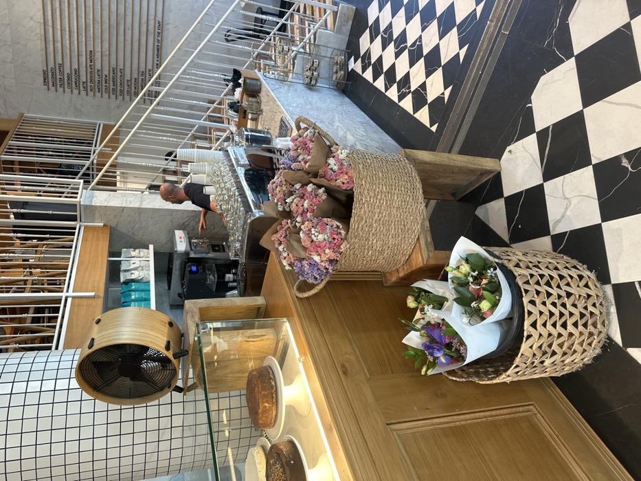 This image depicts the interior of a modern cafe, identified as being located in Tel-Aviv, Israel. The scene is observed from a slightly elevated perspective, showcasing a multi-level layout. In the foreground and to the left, a light wooden service counter features a glass display case containing three round cakes: a cheesecake, a chocolate cake, and one other. A cylindrical wooden fan with a black grille is positioned on the counter. Below the counter, two natural fiber woven baskets are present. The larger basket, resting on a wooden stand, contains multiple bouquets of small pink and purple dried flowers, each wrapped in brown paper. The smaller basket, placed directly on the checkered floor, holds three fresh flower bouquets, including irises and mixed blooms, wrapped in white paper. In the midground, a bald male barista, wearing a dark t-shirt, is standing behind a marble-topped counter, operating a commercial espresso machine. Stacks of white cups and various coffee preparation tools are visible on the counter. Shelves above the counter display coffee bags. To the right, a white staircase with white balusters ascends to an upper level, which features a wooden railing. Adjacent to the staircase, a white wall displays a vertical menu board listing coffee beverages such as Espresso, Macchiato, Filter Coffee, Cortado, Cappuccino, and Latte. The flooring throughout the visible area is a black and white checkered tile or marble pattern with grey veining. A large, square-tiled pillar is visible on the far left.