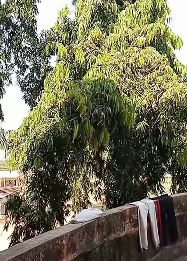 The video depicts an outdoor scene with a tall tree in the foreground. Clothes are draped over a low concrete wall. In the distance, a building is visible. The camera seems to be positioned on a rooftop or a similar elevated platform. The sky is visible in the background.