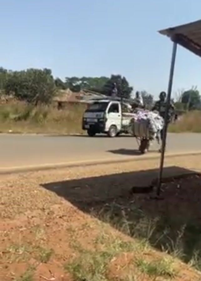 rural road scene. A man is pulling a cart loaded with goods along the road. A small white truck loaded with lumber also drives along the road. The camera is under a corrugated roof of a small structure. The surrounding environment includes dry grasses, trees, and scattered buildings in the background. The sky is clear and bright.