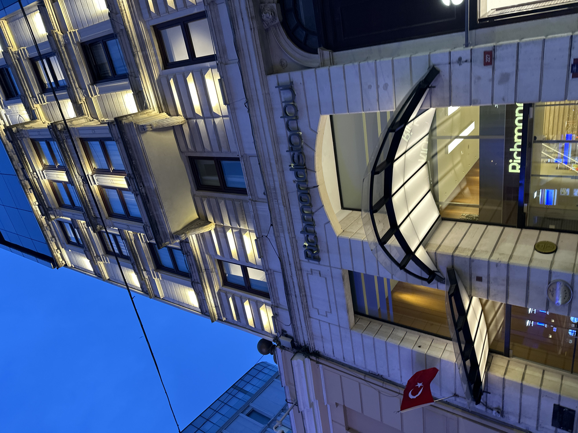 The image displays the exterior of the Richmond Istanbul hotel, located at building number 227 in Beyoğlu, Istanbul, Turkey. The scene is captured during twilight or night, under a deep blue sky. The building's lower and middle sections feature a classical architectural style with stone-colored facade cladding, decorated window frames, and cornices. Multiple linear spotlights are embedded below the windows on several floors, illuminating the facade. The hotel's name, "Richmondistanbul," is affixed in metallic letters above the main entrance, with a partial "Richmond" sign also visible at ground level. A black-framed, curved glass canopy extends over the main entrance. A Turkish national flag, red with a white crescent moon and star, is mounted on a pole protruding from the building's left side, positioned above a smaller, flat glass awning. An adjacent modern building with a glass facade is partially visible on the left. A black utility cable extends diagonally across the upper left portion of the frame. No individuals are visible within the frame.