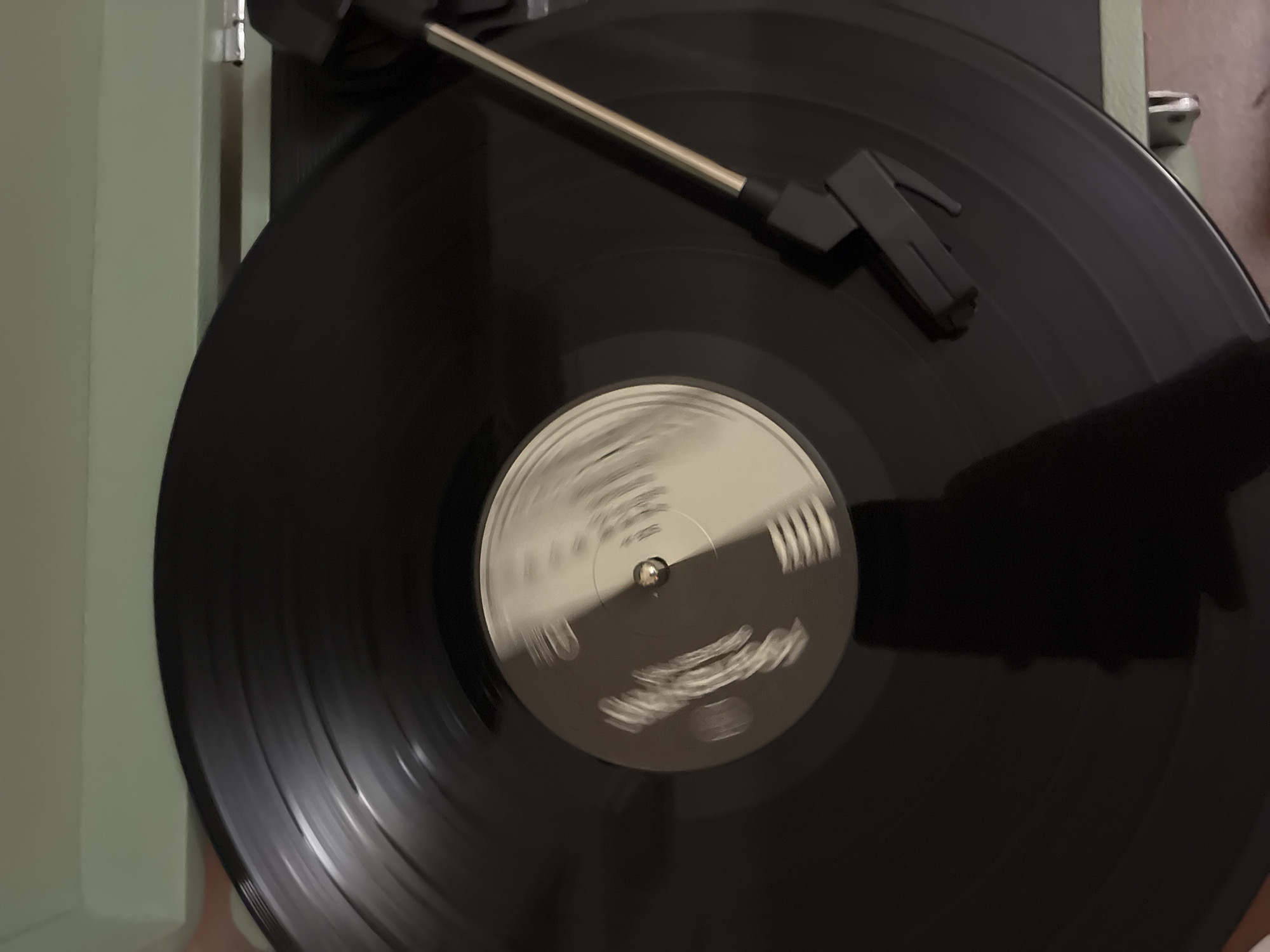 - "An overhead view captures a black vinyl record actively spinning on a light green portable turntable" by FM-y3z5o2, licensed under CC BY 4.0